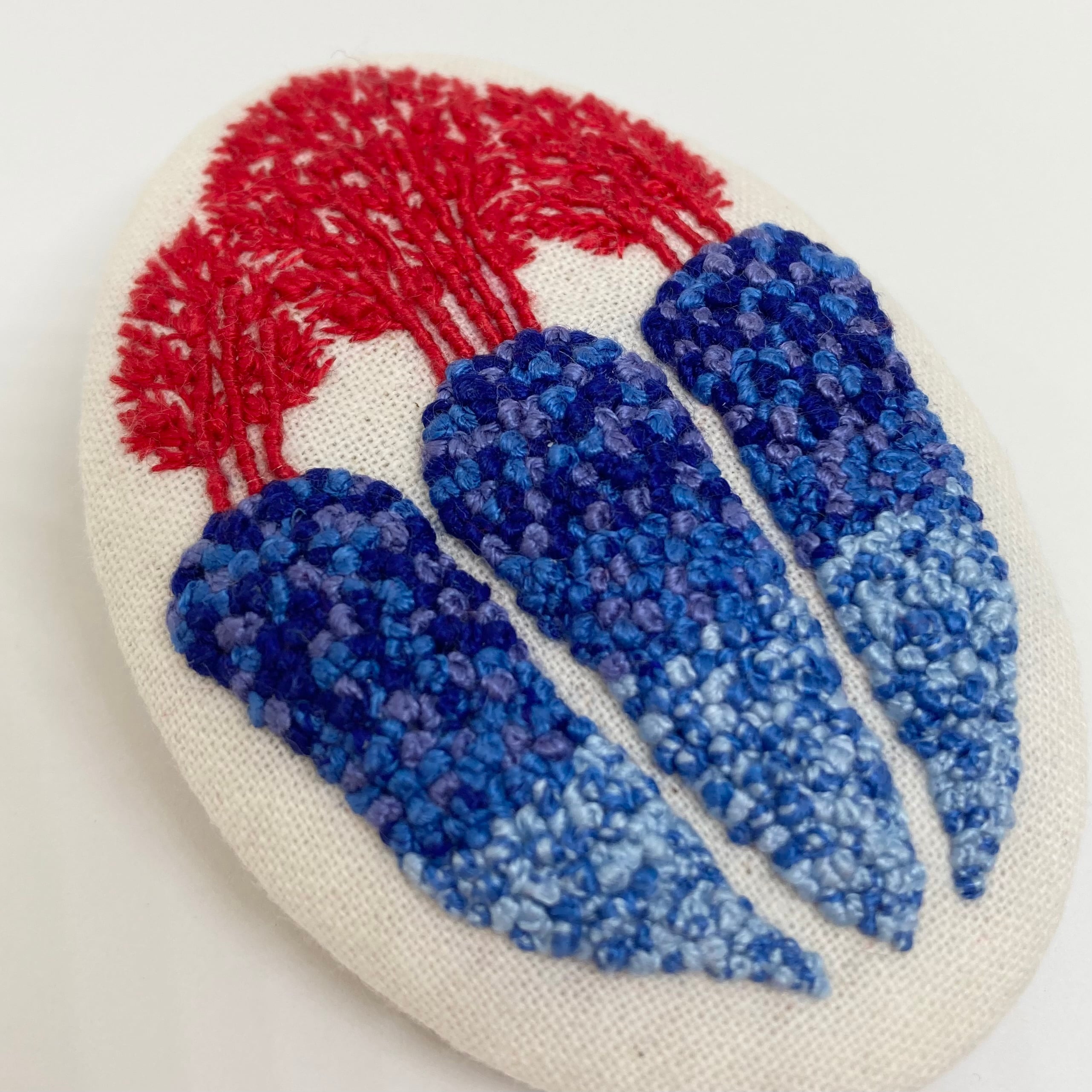 フレンチノットステッチをふんだんに使用し立体感のある仕上がりになっています。刺繍のつぶつぶ感、もりもり感たっぷりのブローチです。