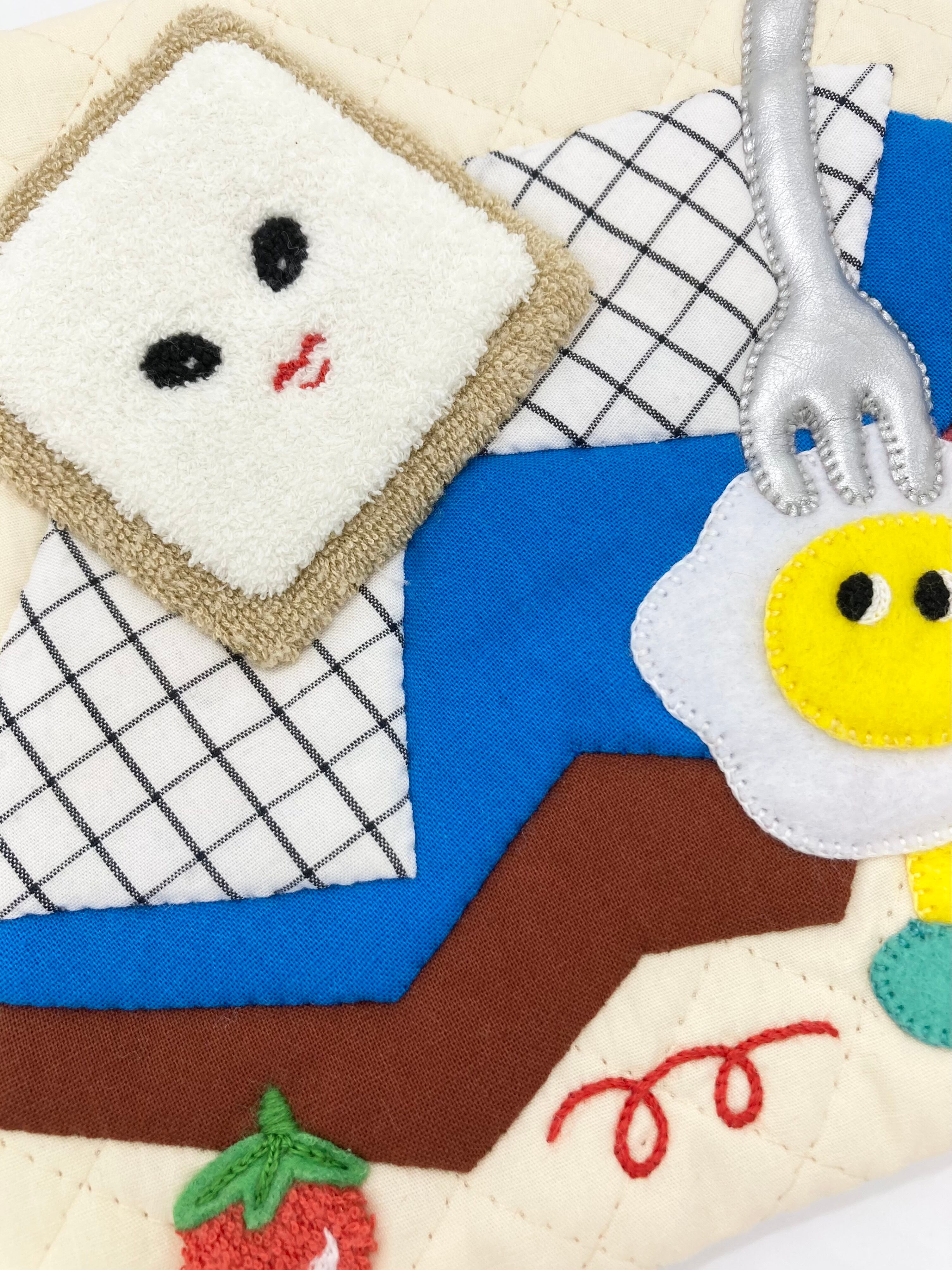 シーチングや合皮生地、タオル地などを組み合わせ、質感の違いも楽しんで頂けるアップリケ作品です。